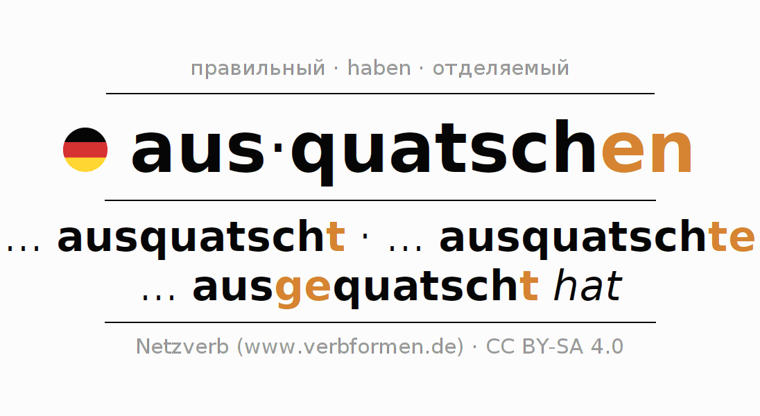 Глагол 'aus·quatschen' онлайн как таблица глаголов со всеми наглядно представленными формами. Значение глагола aus·quatschen таким образом является помощью для выполнения домашних заданий; подготовки к экзаменам и контрольным работам, а также к урокам немецкого языка; для обучения в вузах и при получении образования для взрослых. Именно для изучающих немецкий язык – правильное спряжение глаголов (... ausquatscht - ... ausquatschte - ... ausgequatscht hat) является решающим фактором.