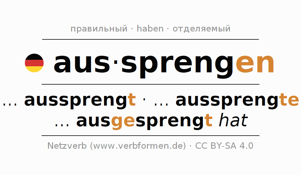 - Презенс: spreng(e) (du) aus, sprengen wir aus, sprengt (ihr) aus, sprengen Sie aus
