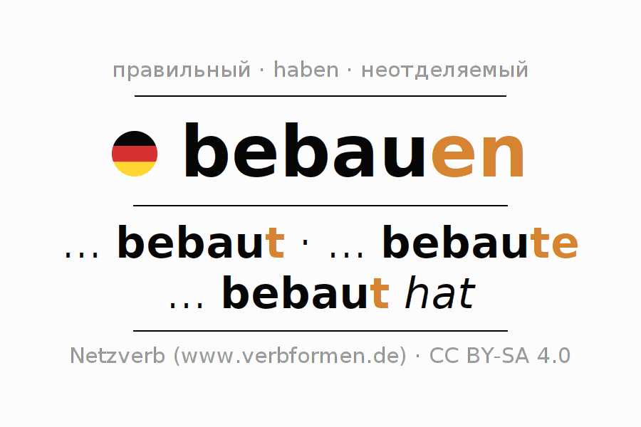 - Презенс: bebau(e) (du), bebau(e)n wir, bebaut (ihr), bebau(e)n Sie