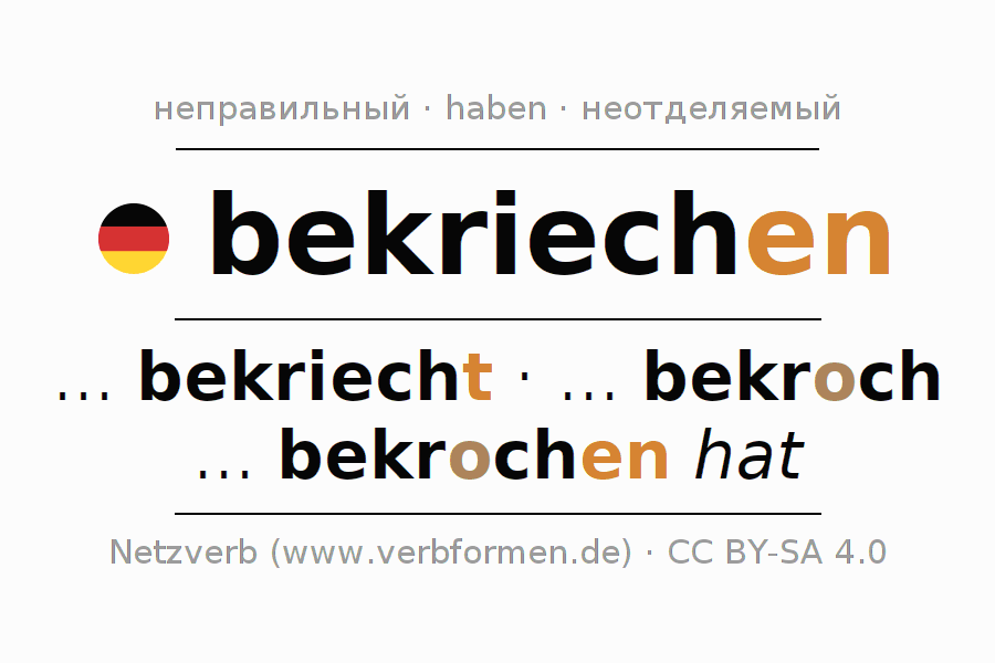 Глагол 'bekriechen' онлайн как таблица глаголов со всеми наглядно представленными формами. Значение глагола bekriechen таким образом является помощью для выполнения домашних заданий; подготовки к экзаменам и контрольным работам, а также к урокам немецкого языка; для обучения в вузах и при получении образования для взрослых. Именно для изучающих немецкий язык – правильное спряжение глаголов (... bekriecht - ... bekroch - ... bekrochen hat) является решающим фактором.