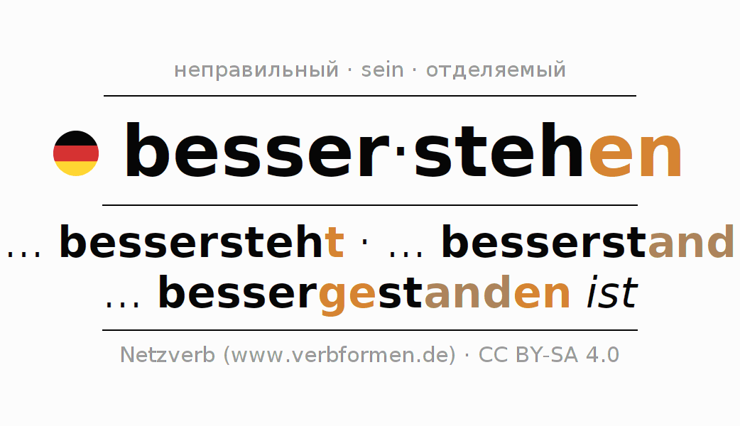 - Презенс: ... ich bessersteh(e), ... du besserstehst, ... er bessersteht, ... wir bessersteh(e)n, ... ihr bessersteht, ... sie bessersteh(e)n