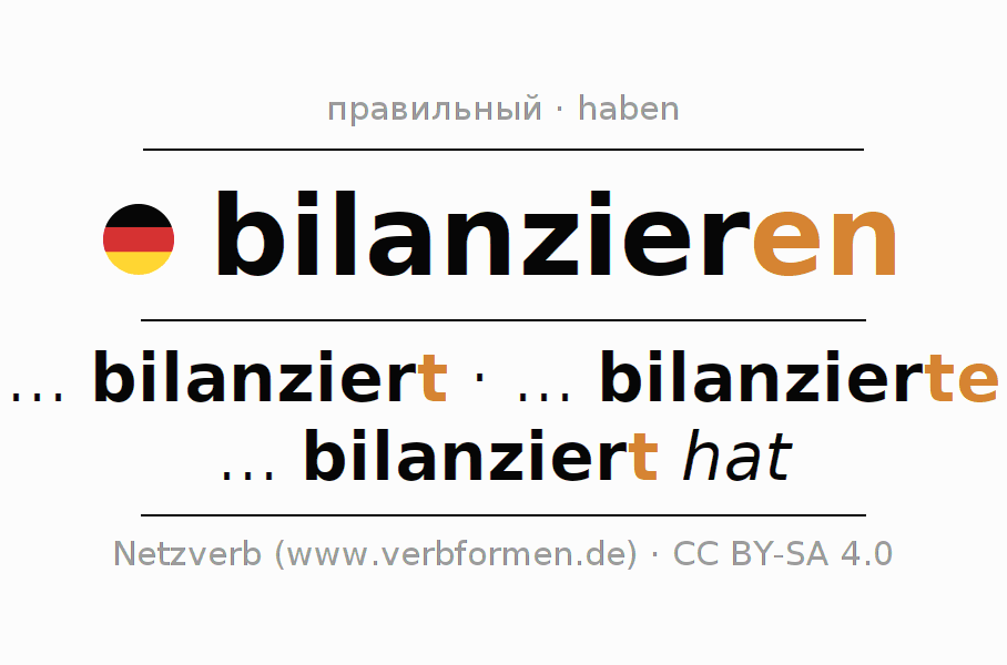 - Презенс: bilanzier(e) (du), bilanzieren wir, bilanziert (ihr), bilanzieren Sie
