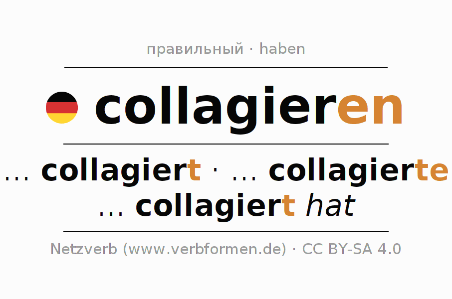 - Презенс: collagier(e) (du), collagieren wir, collagiert (ihr), collagieren Sie