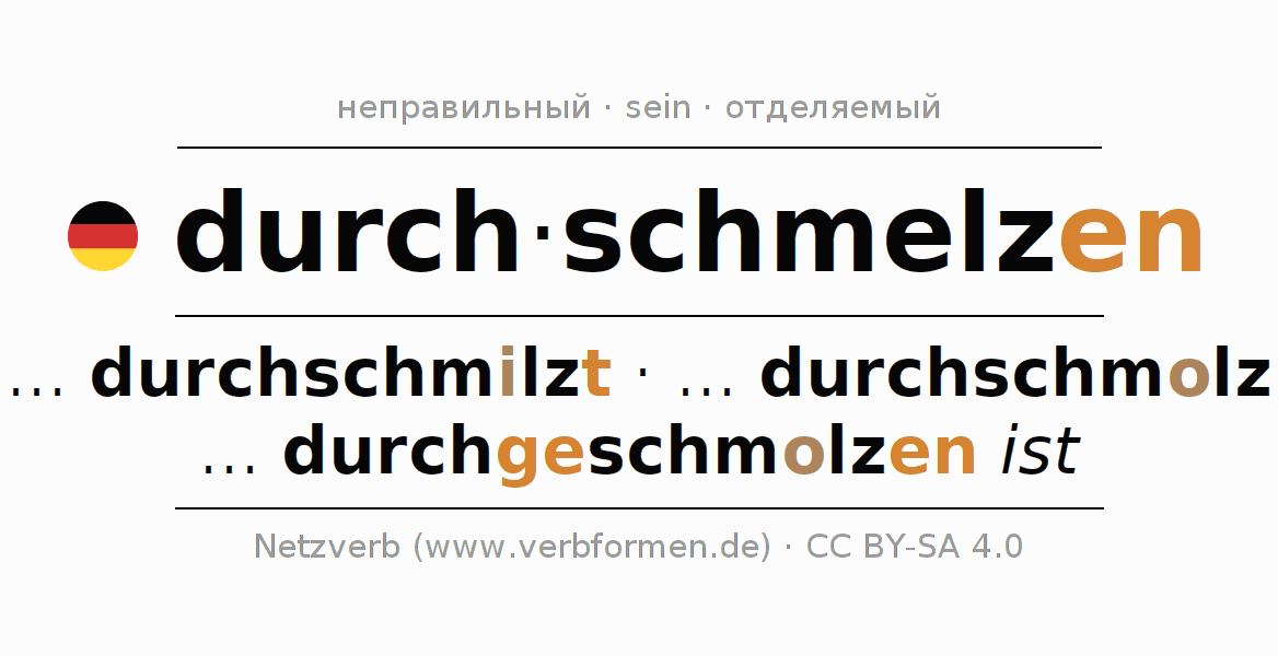 - Презенс: schmilz (du) durch, schmelzen wir durch, schmelzt (ihr) durch, schmelzen Sie durch