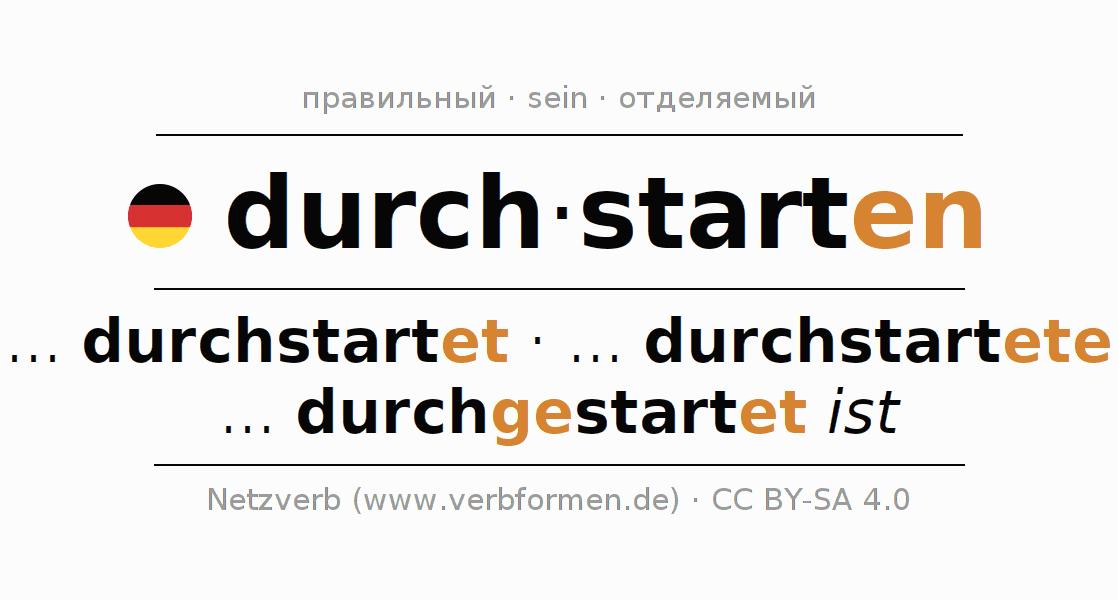 - Презенс: start(e) (du) durch, starten wir durch, startet (ihr) durch, starten Sie durch