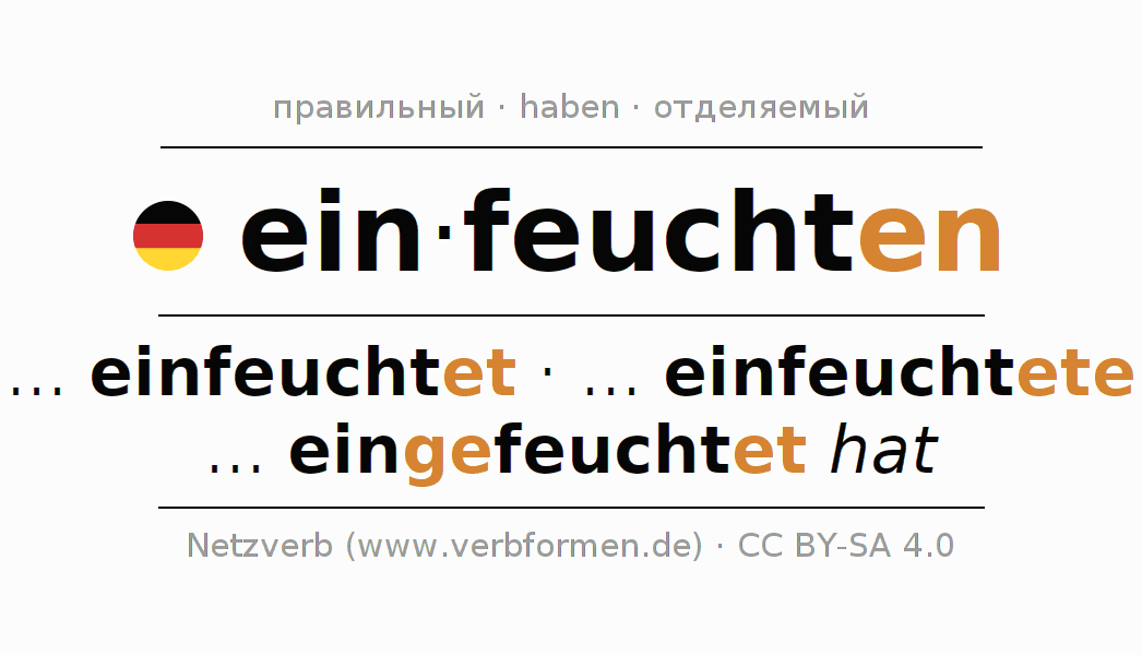 Спряжение глагола einfeuchten (увлажнять) правильное. Формы глагола ... einfeuchtet, ... einfeuchtete, ... eingefeuchtet hat. В качестве вспомогательного глагола к einfeuchten употребляется "haben". Приставка ein- для einfeuchten отделяемая. Склоняется в Действительный залог (актив) и употребляется в Придаточное предложение. Для лучшего понимания приводится большое количество примеров употребления глагола einfeuchten. Для тренировки и закрепления навыков имеются также бесплатные рабочие листы по einfeuchten. Можно не только einfeuchten спрягать, но и все немецкие глаголы. Kомментарии ☆