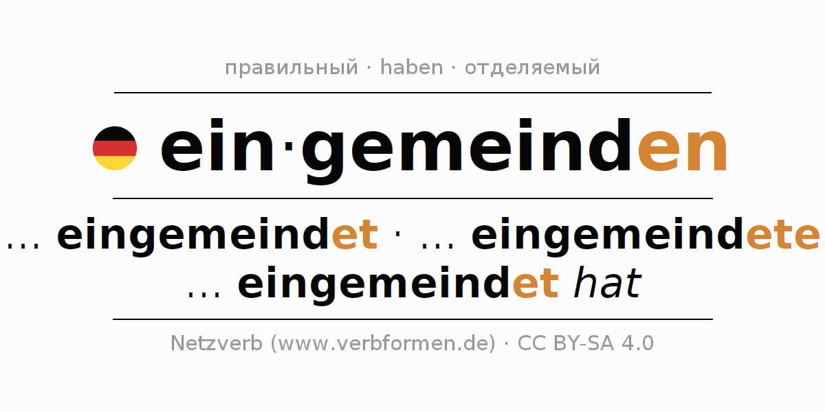 Глагол eingemeinden спрягается в индикативе Действительный залог (актив) в настоящем, прошедшем и будущем времени