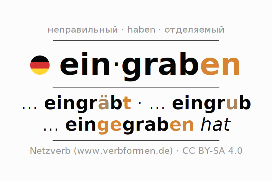 - Презенс: grab(e) (du) ein, graben wir ein, grabt (ihr) ein, graben Sie ein
