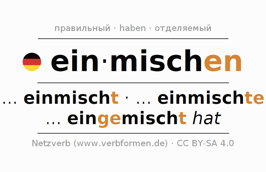 - Презенс: misch(e) (du) ein, mischen wir ein, mischt (ihr) ein, mischen Sie ein