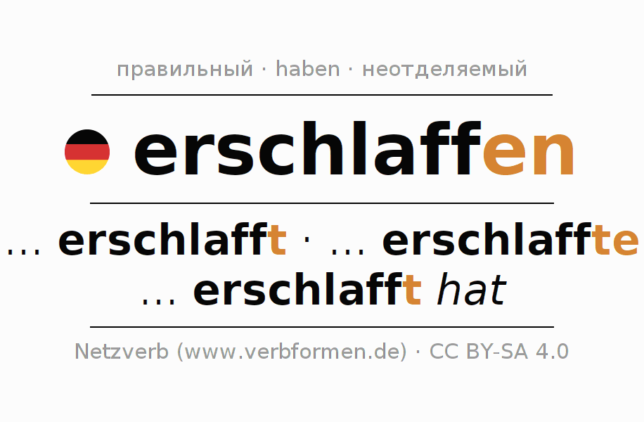 Спряжение глагола erschlaffen (ослабевать, ослабеть) правильное. Формы глагола ... erschlafft, ... erschlaffte, ... erschlafft hat. В качестве вспомогательного глагола к erschlaffen употребляется "haben". Однако имеются временные формы со вспомогательным глаголом sein. Приставка er- для erschlaffen неотделяемая. Склоняется в Действительный залог (актив) и употребляется в Придаточное предложение. Для лучшего понимания приводится большое количество примеров употребления глагола erschlaffen. Для тренировки и закрепления навыков имеются также бесплатные рабочие листы по erschlaffen. Можно не только erschlaffen спрягать, но и все немецкие глаголы. Глагол включён в словарный запас обладателя сертификата знания немецкого языка уровня C2. Kомментарии ☆