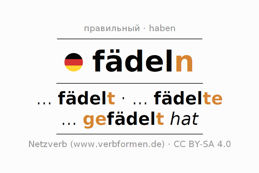 - Презенс: ... ich fäd(e)l(e), ... du fädelst, ... er fädelt, ... wir fädeln, ... ihr fädelt, ... sie fädeln