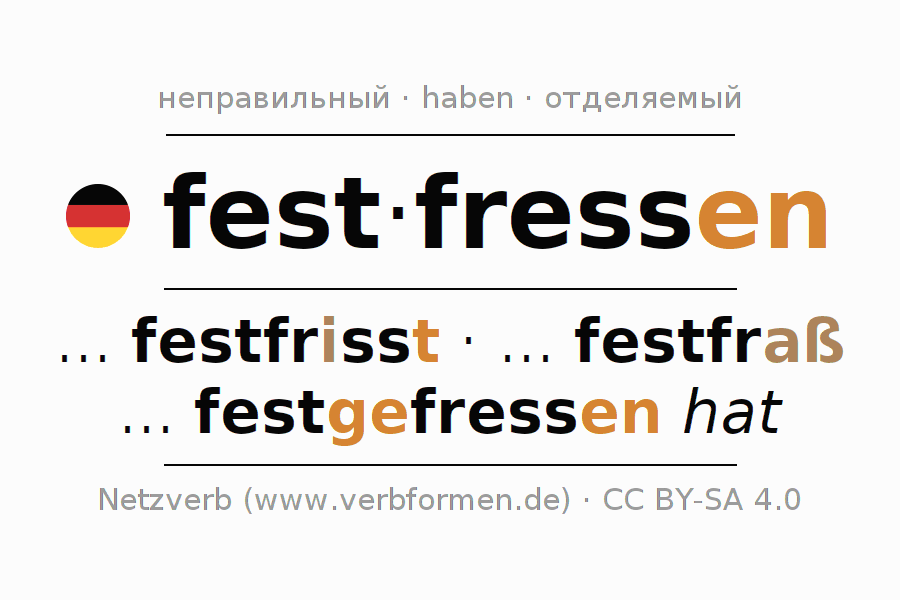- Презенс: friss (du) fest, fressen wir fest, fresst (ihr) fest, fressen Sie fest