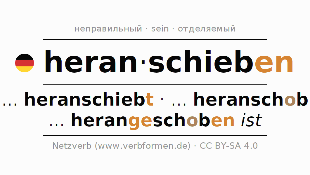 - Презенс: schieb(e) (du) heran, schieben wir heran, schiebt (ihr) heran, schieben Sie heran