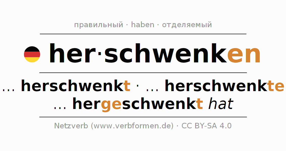 - Презенс: schwenk(e) (du) her, schwenken wir her, schwenkt (ihr) her, schwenken Sie her
