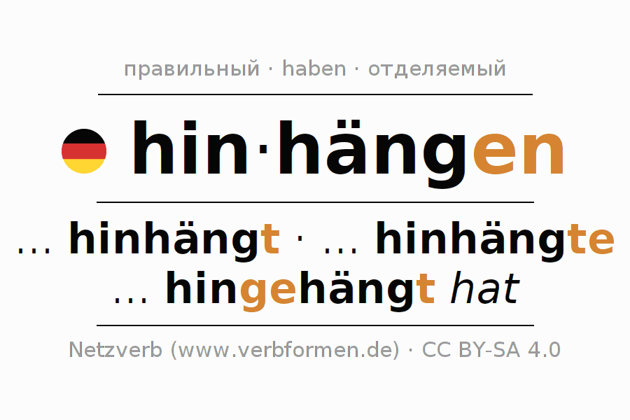 Спряжение глагола hinhängen (вешать, оставлять) правильное. Формы глагола ... hinhängt, ... hinhängte, ... hingehängt hat. Кроме того, здесь есть и неправильное спряжение . В качестве вспомогательного глагола к hinhängen употребляется "haben". Приставка hin- для hinhängen отделяемая. Склоняется в Действительный залог (актив) и употребляется в Придаточное предложение. Для лучшего понимания приводится большое количество примеров употребления глагола hinhängen. Для тренировки и закрепления навыков имеются также бесплатные рабочие листы по hinhängen. Можно не только hinhängen спрягать, но и все немецкие глаголы. Kомментарии ☆