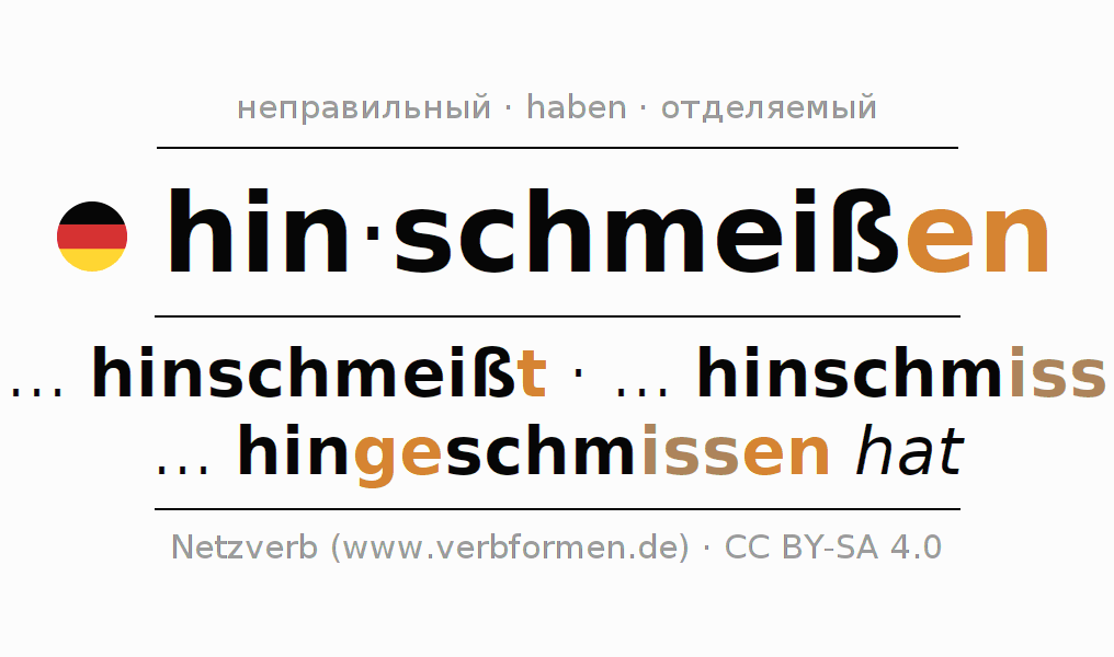 Глагол hinschmeißen спрягается в индикативе Действительный залог (актив) в настоящем, прошедшем и будущем времени