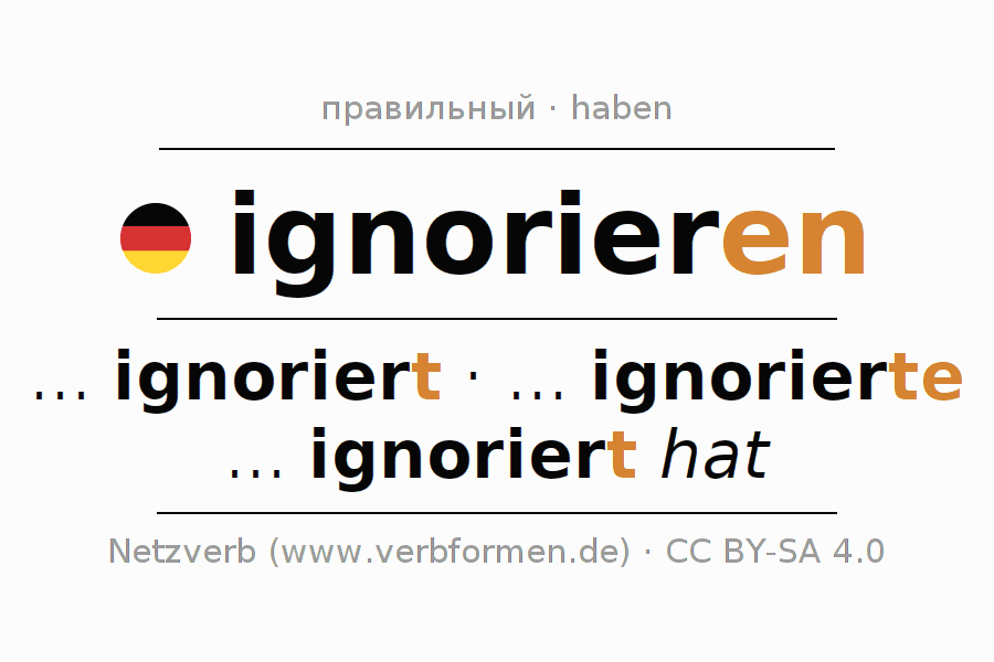 - Презенс: ... ich ignorier(e), ... du ignorierst, ... er ignoriert, ... wir ignorieren, ... ihr ignoriert, ... sie ignorieren