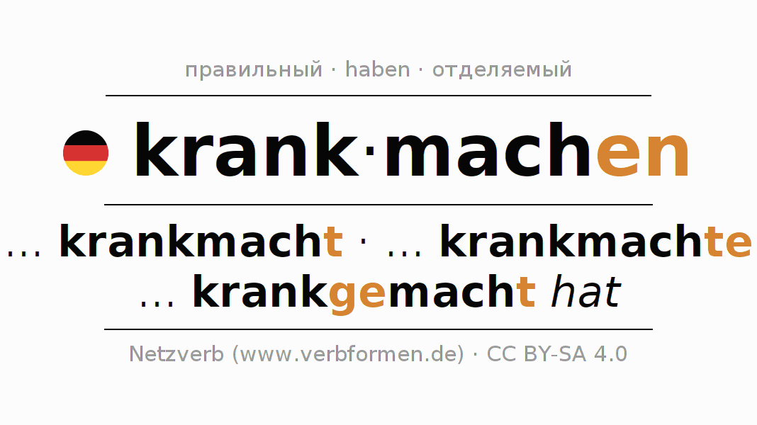 Спряжение глагола krankmachen (больничный, вызывать болезнь) правильное. Формы глагола ... krankmacht, ... krankmachte, ... krankgemacht hat. В качестве вспомогательного глагола к krankmachen употребляется "haben". Приставка krank- для krankmachen отделяемая. Склоняется в Действительный залог (актив) и употребляется в Придаточное предложение. Для лучшего понимания приводится большое количество примеров употребления глагола krankmachen. Для тренировки и закрепления навыков имеются также бесплатные рабочие листы по krankmachen. Можно не только krankmachen спрягать, но и все немецкие глаголы. Глагол включён в словарный запас обладателя сертификата знания немецкого языка уровня C2. Kомментарии ☆