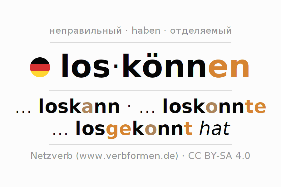 Глагол 'los·können' онлайн как таблица глаголов со всеми наглядно представленными формами. Значение глагола los·können таким образом является помощью для выполнения домашних заданий; подготовки к экзаменам и контрольным работам, а также к урокам немецкого языка; для обучения в вузах и при получении образования для взрослых. Именно для изучающих немецкий язык – правильное спряжение глаголов (... loskann - ... loskonnte - ... losgekonnt hat) является решающим фактором.