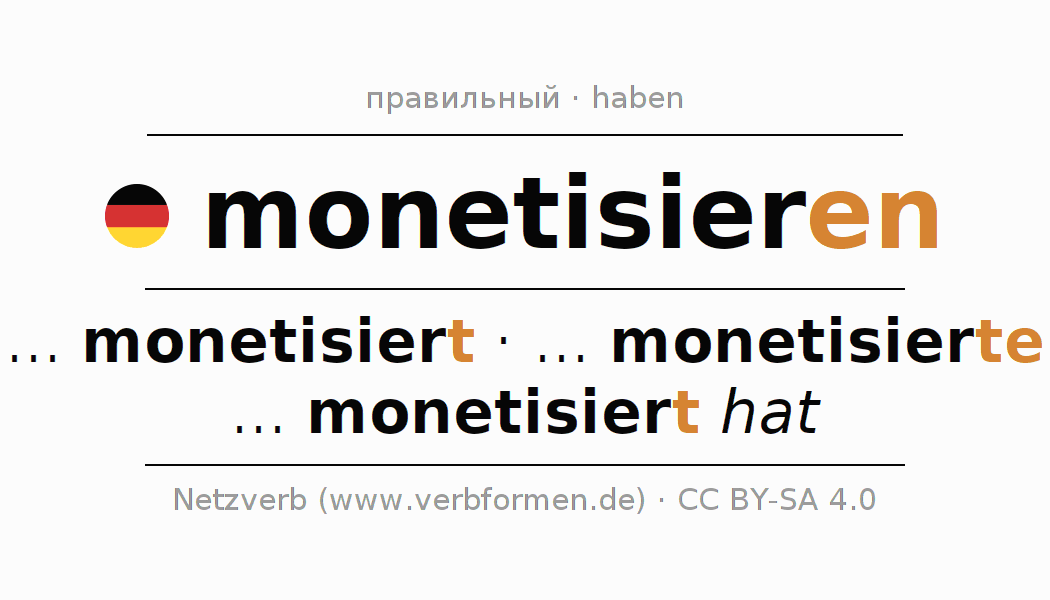 - Презенс: monetisier(e) (du), monetisieren wir, monetisiert (ihr), monetisieren Sie