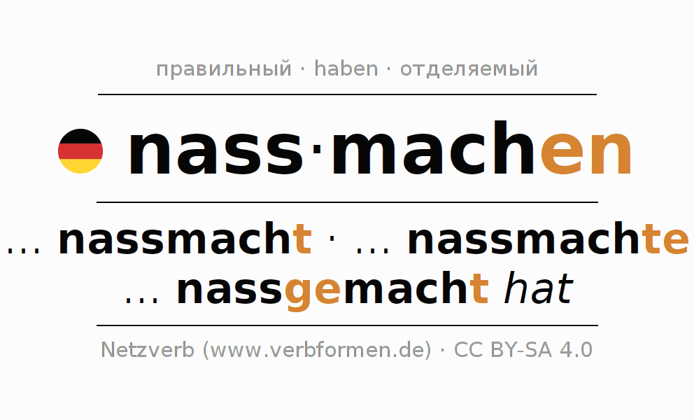 - Презенс: mach(e) (du) nass, machen wir nass, macht (ihr) nass, machen Sie nass