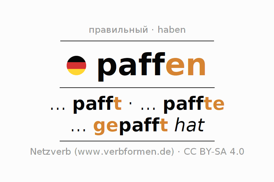 - Презенс: ... ich paff(e), ... du paffst, ... er pafft, ... wir paffen, ... ihr pafft, ... sie paffen