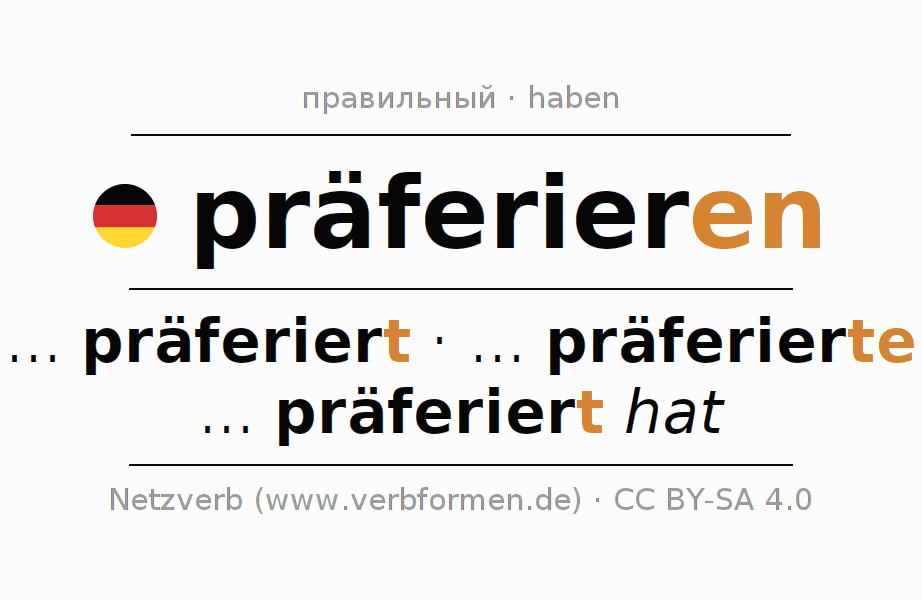 - Презенс: präferier(e) (du), präferieren wir, präferiert (ihr), präferieren Sie