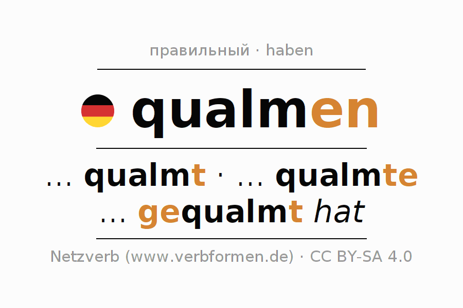 - Презенс: qualm(e) (du), qualmen wir, qualmt (ihr), qualmen Sie