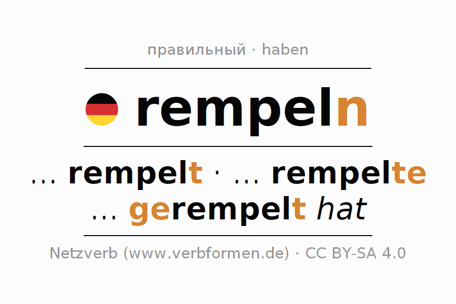 - Презенс: remp(e)l(e) (du), rempeln wir, rempelt (ihr), rempeln Sie