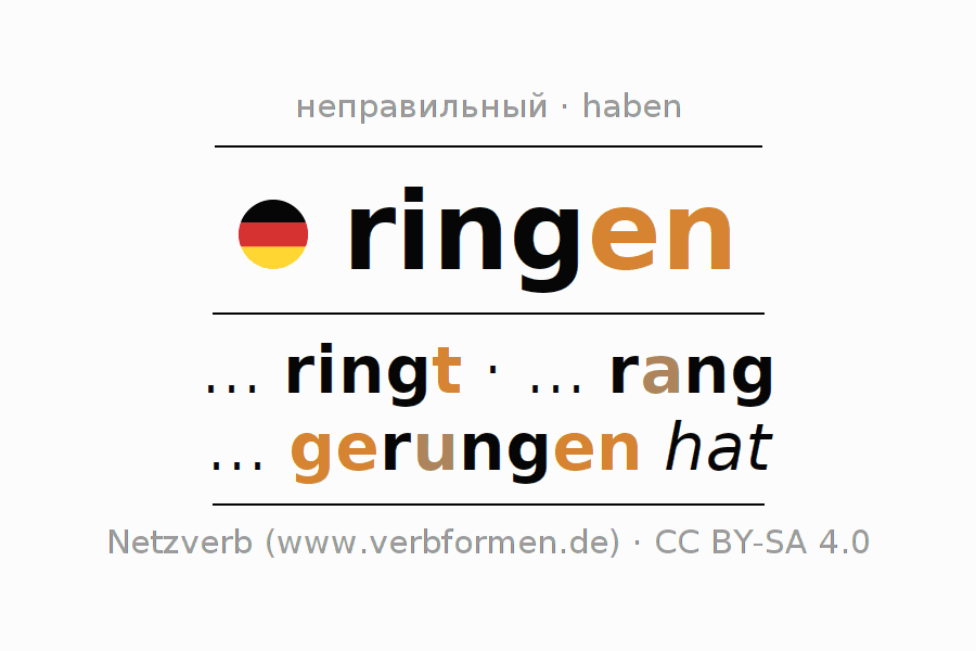 - Презенс: ring(e) (du), ringen wir, ringt (ihr), ringen Sie