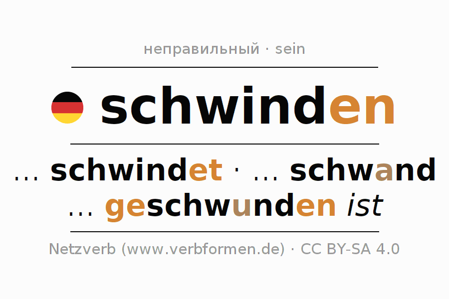 Глагол 'schwinden' онлайн как таблица глаголов со всеми наглядно представленными формами. Значение глагола schwinden таким образом является помощью для выполнения домашних заданий; подготовки к экзаменам и контрольным работам, а также к урокам немецкого языка; для обучения в вузах и при получении образования для взрослых. Именно для изучающих немецкий язык – правильное спряжение глаголов (... schwindet - ... schwand - ... geschwunden ist) является решающим фактором.