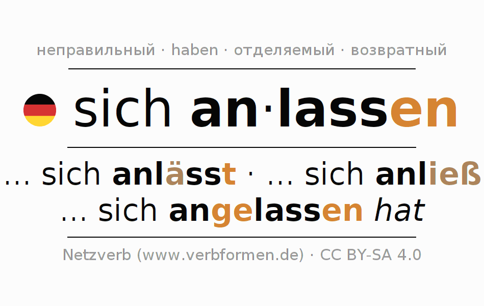 Спряжение глагола anlassen (не снимать, завести) неправильное. Формы глагола ... sich anlässt, ... sich anließ, ... sich angelassen hat. Чередующиеся гласные a - ie - a в корне: В качестве вспомогательного глагола к sich anlassen употребляется "haben". Глагол sich anlassen употреблён в возвратной форме. Может употреблятьсяи невозвратная форма глагола. Приставка an- для sich anlassen отделяемая. Склоняется в Действительный залог (актив) и употребляется в Придаточное предложение. Для лучшего понимания приводится большое количество примеров употребления глагола anlassen. Для тренировки и закрепления навыков имеются также бесплатные рабочие листы по anlassen. Можно не только sich anlassen спрягать, но и все немецкие глаголы. Глагол включён в словарный запас обладателя сертификата знания немецкого языка уровня A2. Kомментарии ☆