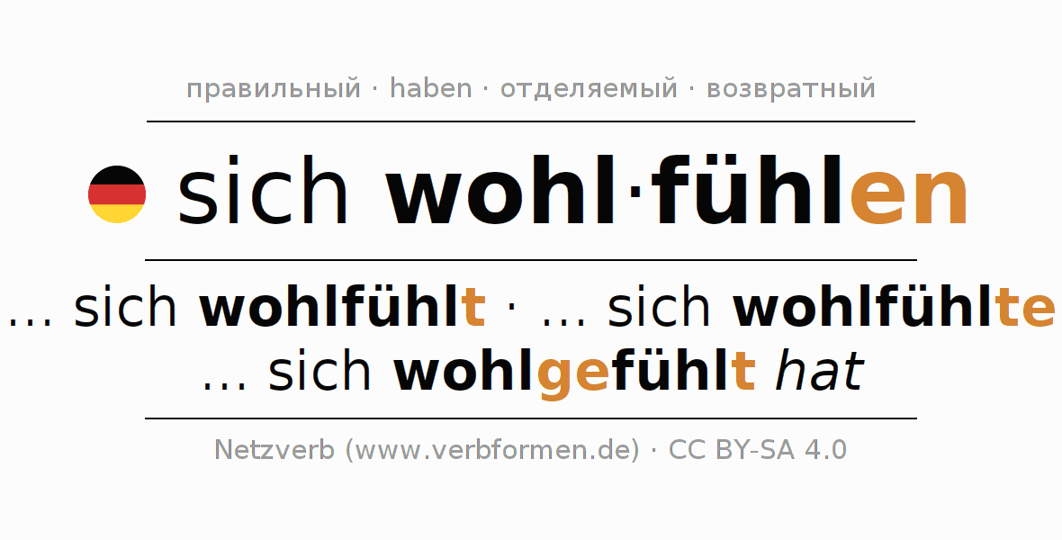Простые формы спряжения глаголов в презенсе, претеритуме, императиве и конъюнктиве sich wohlfühlen
