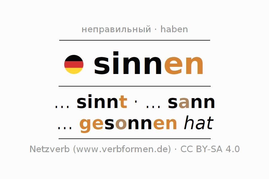 - Презенс: sinn(e) (du), sinnen wir, sinnt (ihr), sinnen Sie