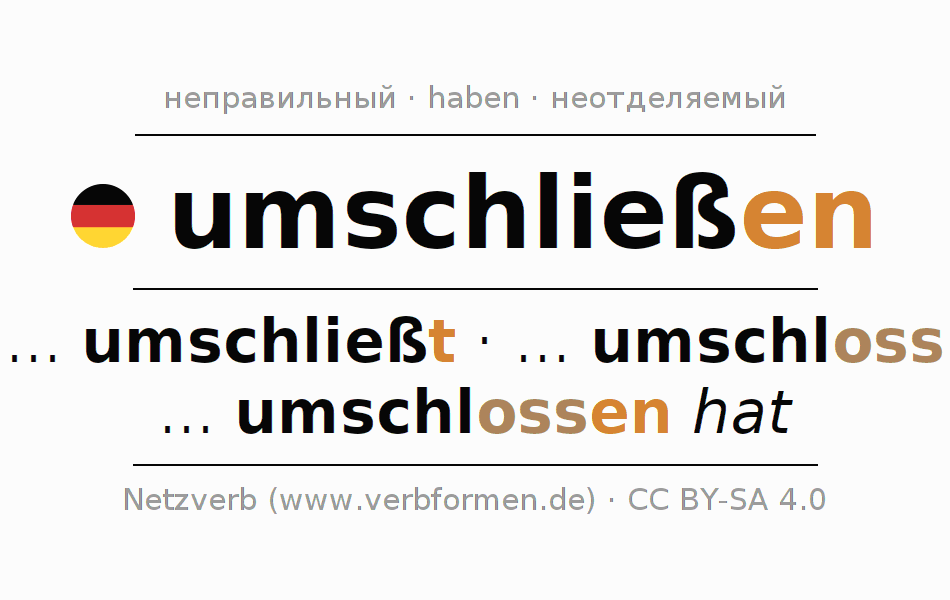 - Презенс: umschließ(e) (du), umschließen wir, umschließt (ihr), umschließen Sie