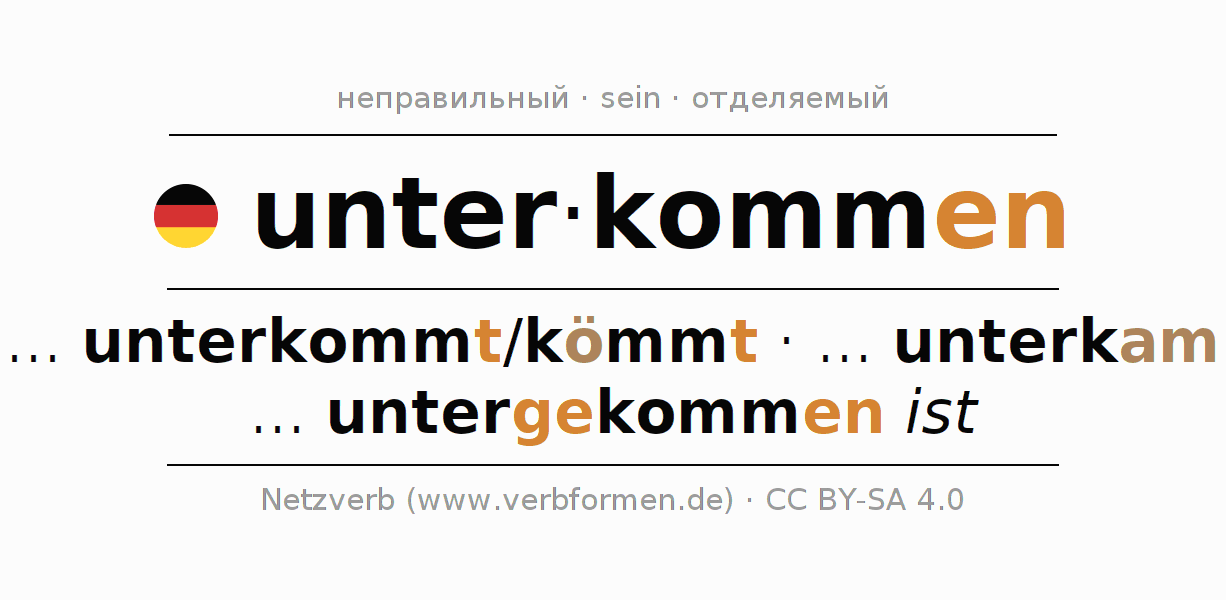 Спряжение глагола unterkommen (устроиться, устраиваться) неправильное. Формы глагола ... unterkommt/kömmt, ... unterkam, ... untergekommen ist. Чередующиеся гласные o - a - o в корне: В качестве вспомогательного глагола к unterkommen употребляется "sein". Приставка unter- для unterkommen отделяемая. Склоняется в Действительный залог (актив) и употребляется в Придаточное предложение. Для лучшего понимания приводится большое количество примеров употребления глагола unterkommen. Для тренировки и закрепления навыков имеются также бесплатные рабочие листы по unterkommen. Можно не только unterkommen спрягать, но и все немецкие глаголы. Глагол включён в словарный запас обладателя сертификата знания немецкого языка уровня B2. Kомментарии ☆