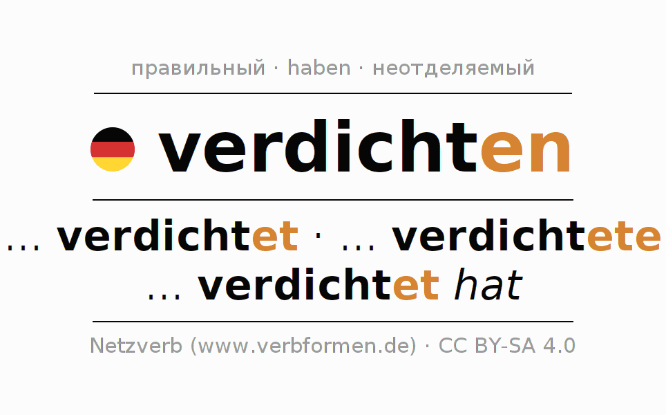 - Презенс: verdicht(e) (du), verdichten wir, verdichtet (ihr), verdichten Sie