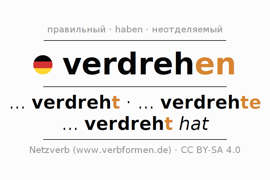 Глагол 'verdrehen' онлайн как таблица глаголов со всеми наглядно представленными формами. Значение глагола verdrehen таким образом является помощью для выполнения домашних заданий; подготовки к экзаменам и контрольным работам, а также к урокам немецкого языка; для обучения в вузах и при получении образования для взрослых. Именно для изучающих немецкий язык – правильное спряжение глаголов (... verdreht - ... verdrehte - ... verdreht hat) является решающим фактором.