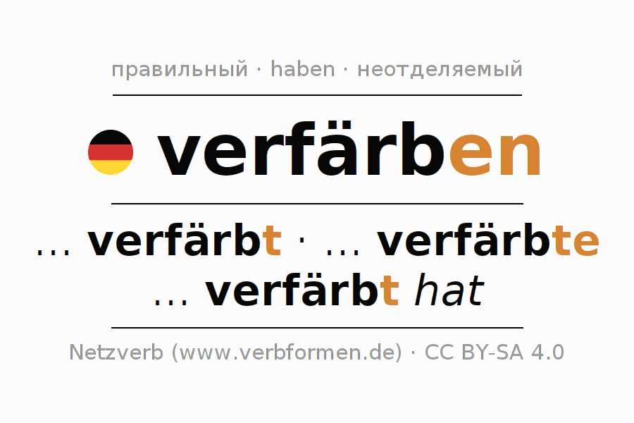 - Презенс: verfärb(e) (du), verfärben wir, verfärbt (ihr), verfärben Sie