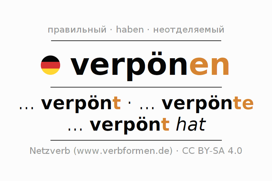 - Презенс: ... ich verpön(e), ... du verpönst, ... er verpönt, ... wir verpönen, ... ihr verpönt, ... sie verpönen