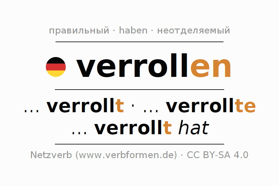 - Презенс: verroll(e) (du), verrollen wir, verrollt (ihr), verrollen Sie