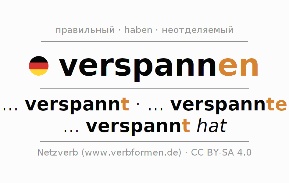 - Презенс: ... ich verspann(e), ... du verspannst, ... er verspannt, ... wir verspannen, ... ihr verspannt, ... sie verspannen