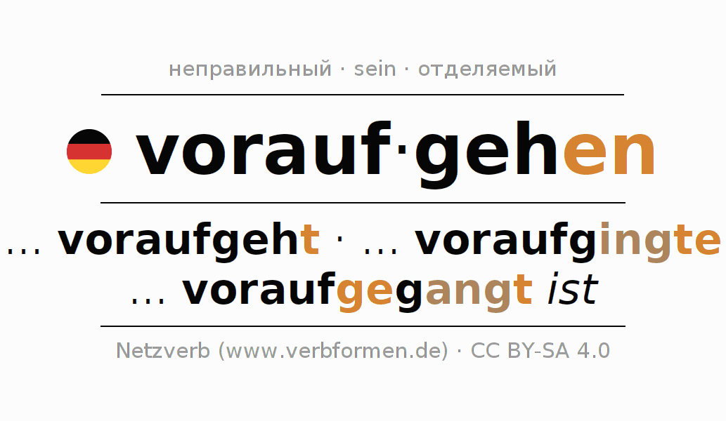 - Инфинитив I: voraufgeh(e)n, voraufzugeh(e)n