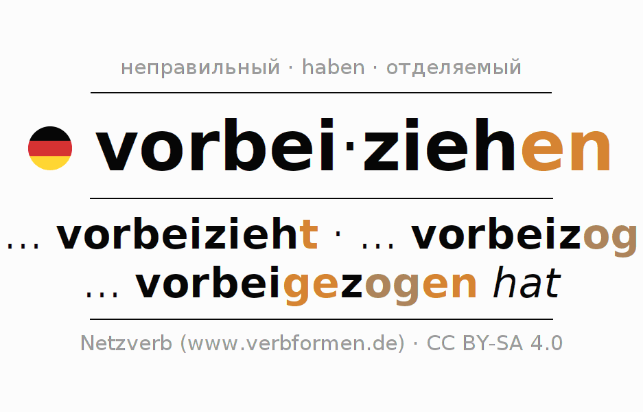 - Инфинитив I: vorbeizieh(e)n, vorbeizuzieh(e)n