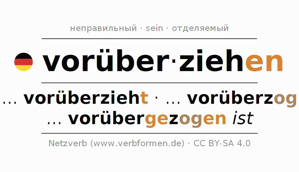 - Инфинитив I: vorüberzieh(e)n, vorüberzuzieh(e)n