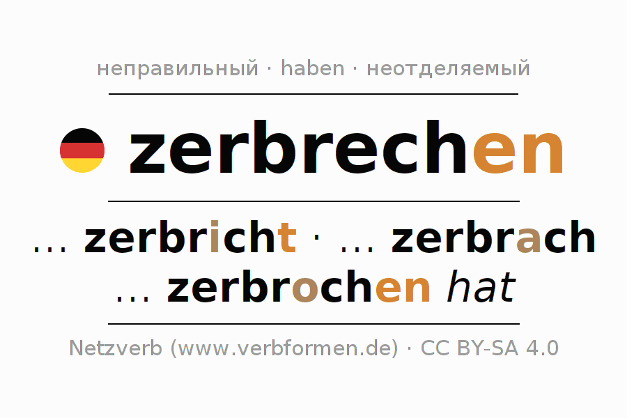 Спряжение глагола zerbrechen (разбивать, ломать) неправильное. Формы глагола ... zerbricht, ... zerbrach, ... zerbrochen hat. Чередующиеся гласные e - a - o в корне: В качестве вспомогательного глагола к zerbrechen употребляется "haben". Однако имеются временные формы со вспомогательным глаголом sein. Приставка zer- для zerbrechen неотделяемая. Склоняется в Действительный залог (актив) и употребляется в Придаточное предложение. Для лучшего понимания приводится большое количество примеров употребления глагола zerbrechen. Для тренировки и закрепления навыков имеются также бесплатные рабочие листы по zerbrechen. Можно не только zerbrechen спрягать, но и все немецкие глаголы. Глагол включён в словарный запас обладателя сертификата знания немецкого языка уровня C2. Kомментарии ☆