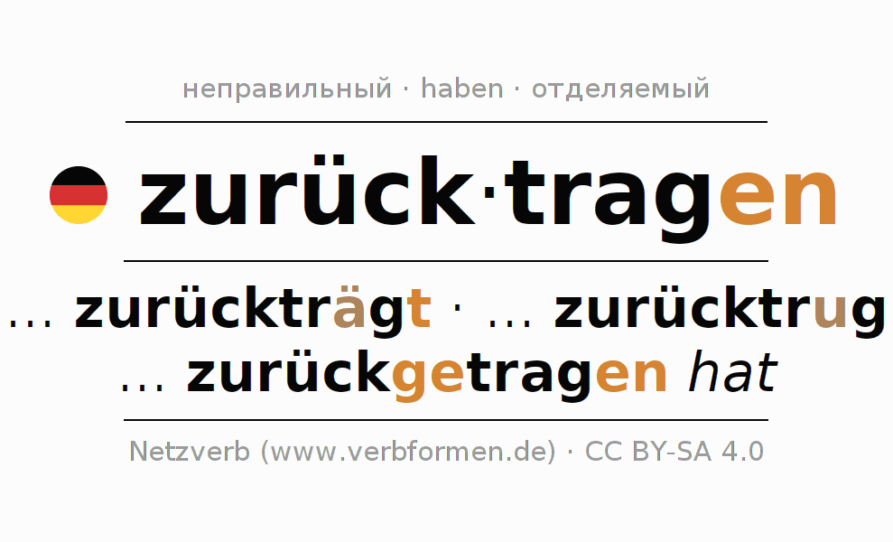 - Презенс: trag(e) (du) zurück, tragen wir zurück, tragt (ihr) zurück, tragen Sie zurück