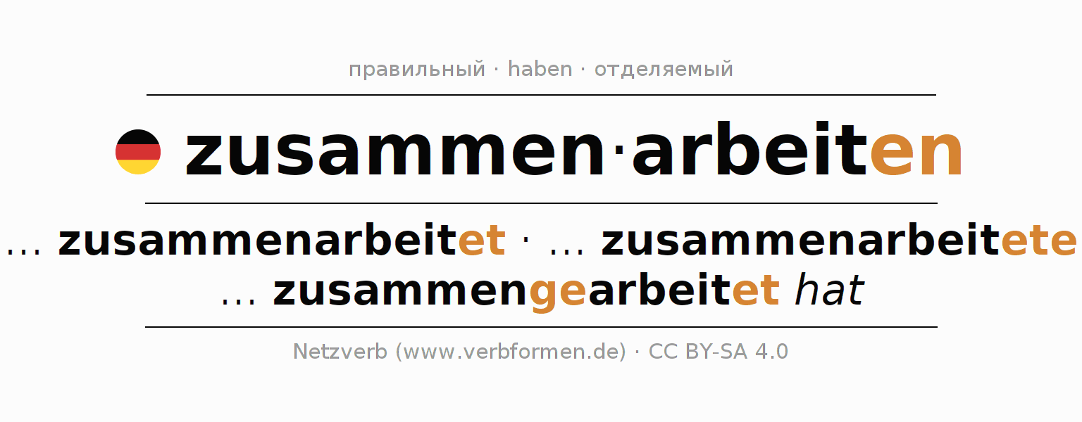 - Презенс: ... ich zusammenarbeit(e), ... du zusammenarbeitest, ... er zusammenarbeitet, ... wir zusammenarbeiten, ... ihr zusammenarbeitet, ... sie zusammenarbeiten
