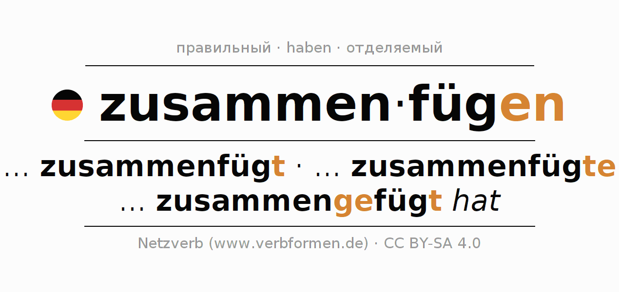 Все временные формы глагола и отглагольных форм zusammenfügen