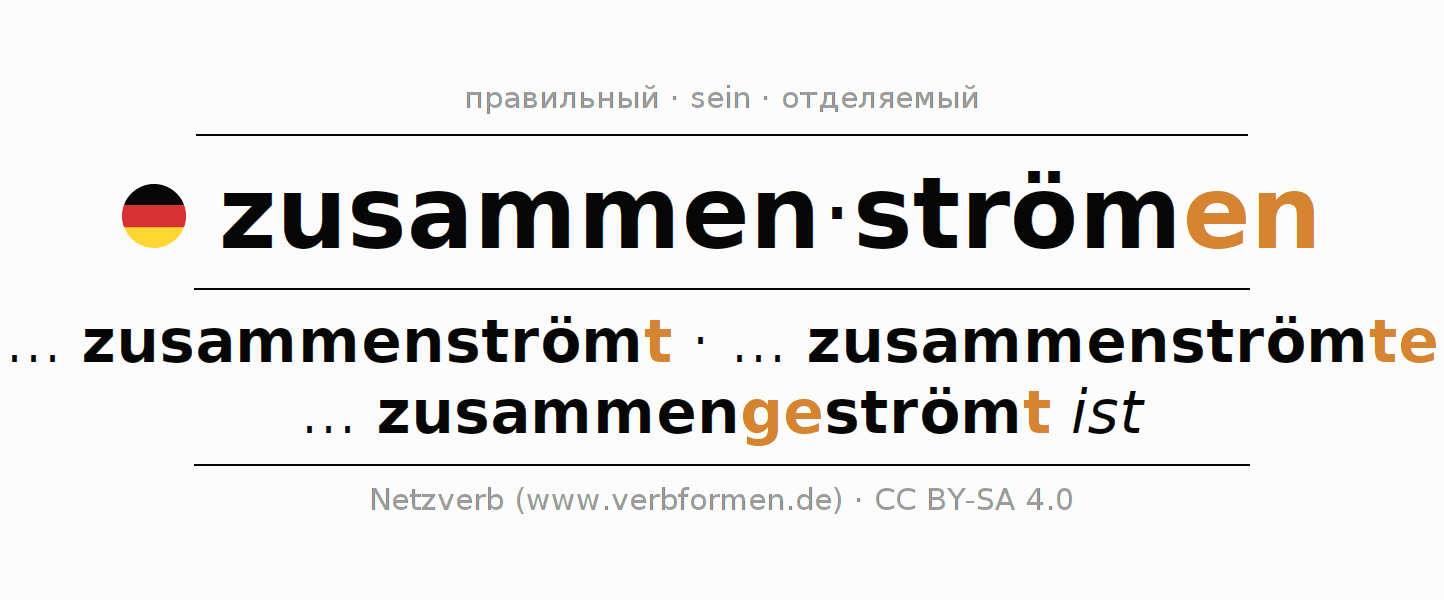 - Презенс: ström(e) (du) zusammen, strömen wir zusammen, strömt (ihr) zusammen, strömen Sie zusammen